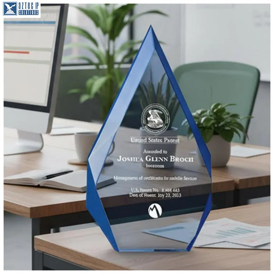 Crafted from 1-inch thick clear acrylic, accented with bold blue bevels, it combines durability with elegance. The frosted white engraving ensures crisp personalization, making logos, names, and patent details stand out beautifully.