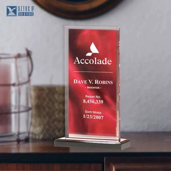 Celebrate groundbreaking achievements with the Crimson Innovation Patent Award, a striking recognition piece designed for inventors, innovators, and trailblazers. Crafted from premium clear acrylic, this award showcases a deep crimson satin backdrop framed by a sleek silver mirror border. Resting on a bold black base accented with a red mirror top, it delivers a modern yet timeless aesthetic that commands attention.