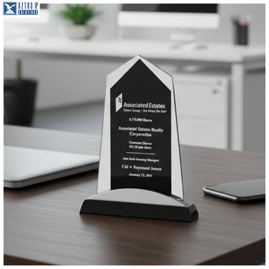 Celebrate excellence with the Apex Crystal Recognition Award, a modern glass trophy designed to honor outstanding achievements. Crafted from 3/8-inch thick beveled glass, this award features a sleek black piano-finish base accented with silver aluminum for a sophisticated look. The reverse laser-engraved personalization creates a striking "look-through effect," ensuring your message of appreciation shines brilliantly.