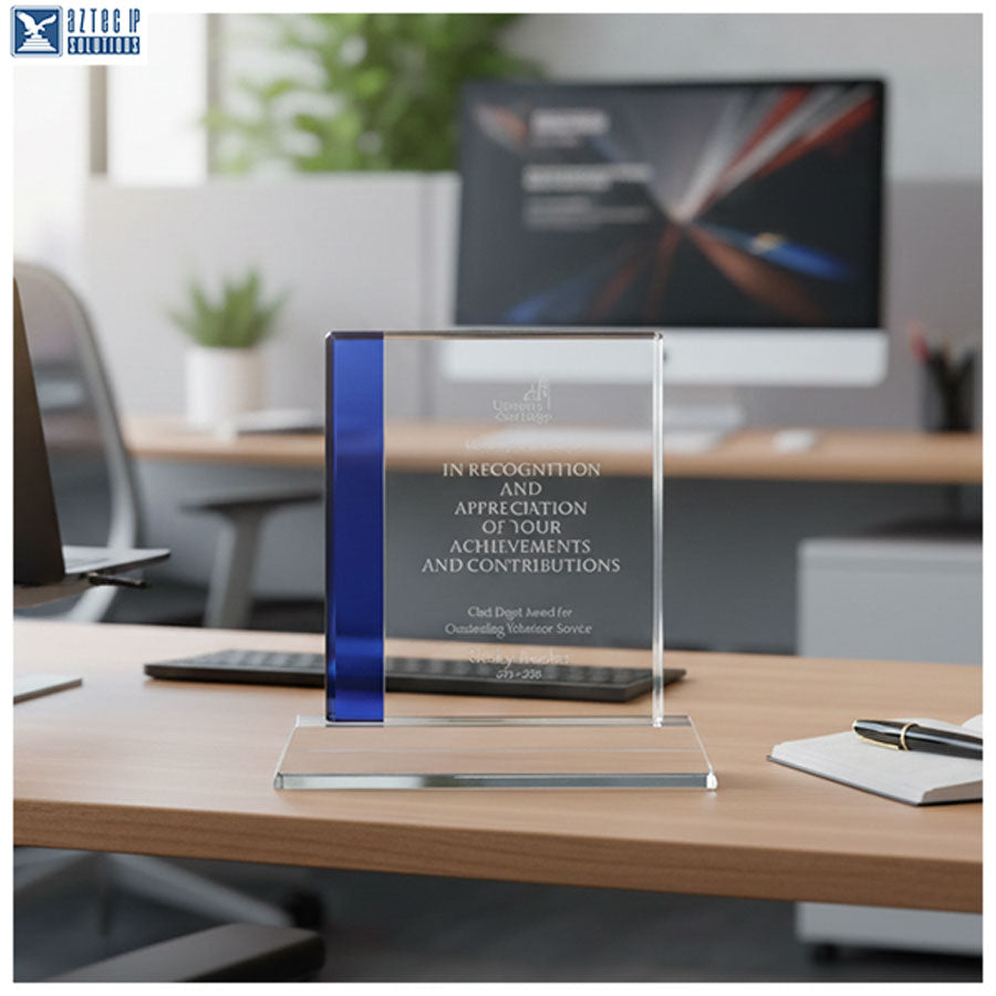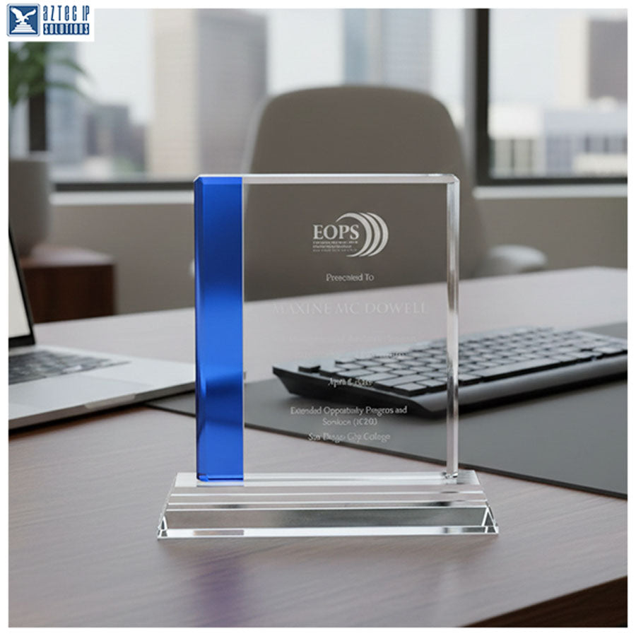 Celebrate excellence with the Blue Radiance Crystal Recognition Award, a stunning showcase of achievement designed to impress in any setting. Crafted from premium optical crystal, this award features a sleek blue edge that adds a modern touch of sophistication. Its 3/4-inch thickness and clear crystal base provide durability and elegance, while the deep-etched engraving creates a frosted, timeless look that will last for generations.