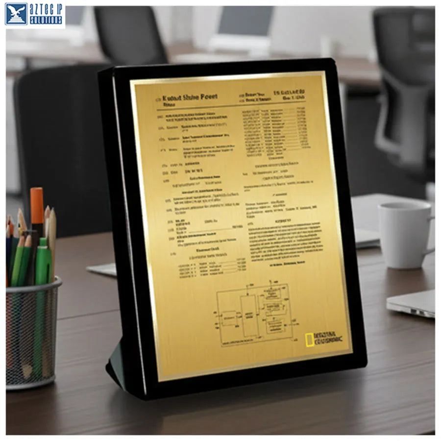 • Striking Presentation: A digitally imprinted Gold HD plate framed in polished metal trim delivers vivid detail and a refined contrast for patent information.