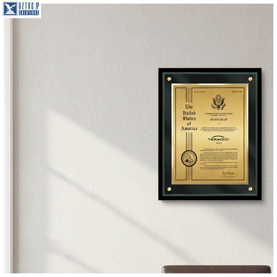 Showcase your brand’s legacy with the PrestigeMark™ Lucite Trademark Display, a premium wall-mounted plaque designed to elevate your corporate identity. Measuring 12" x 15", this elegant display features your trademark digitally imprinted on a Gold HD or Silver HD plate, suspended between two sleek Lucite® panels in black and jade tones.