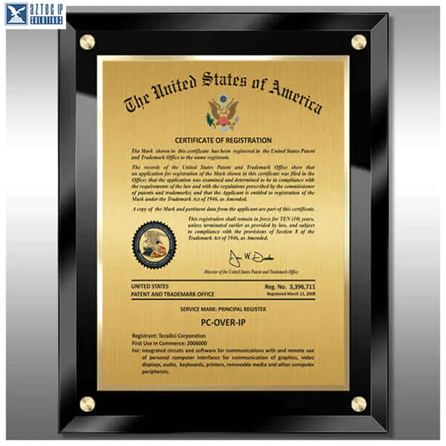 Crafted with high-definition Silver or Gold plates, each plaque features digitally sublimated text and imagery for crisp, lasting presentation. Whether installed individually or as part of a portfolio wall, these plaques elevate your brand presence and reinforce your identity as a trademark owner.