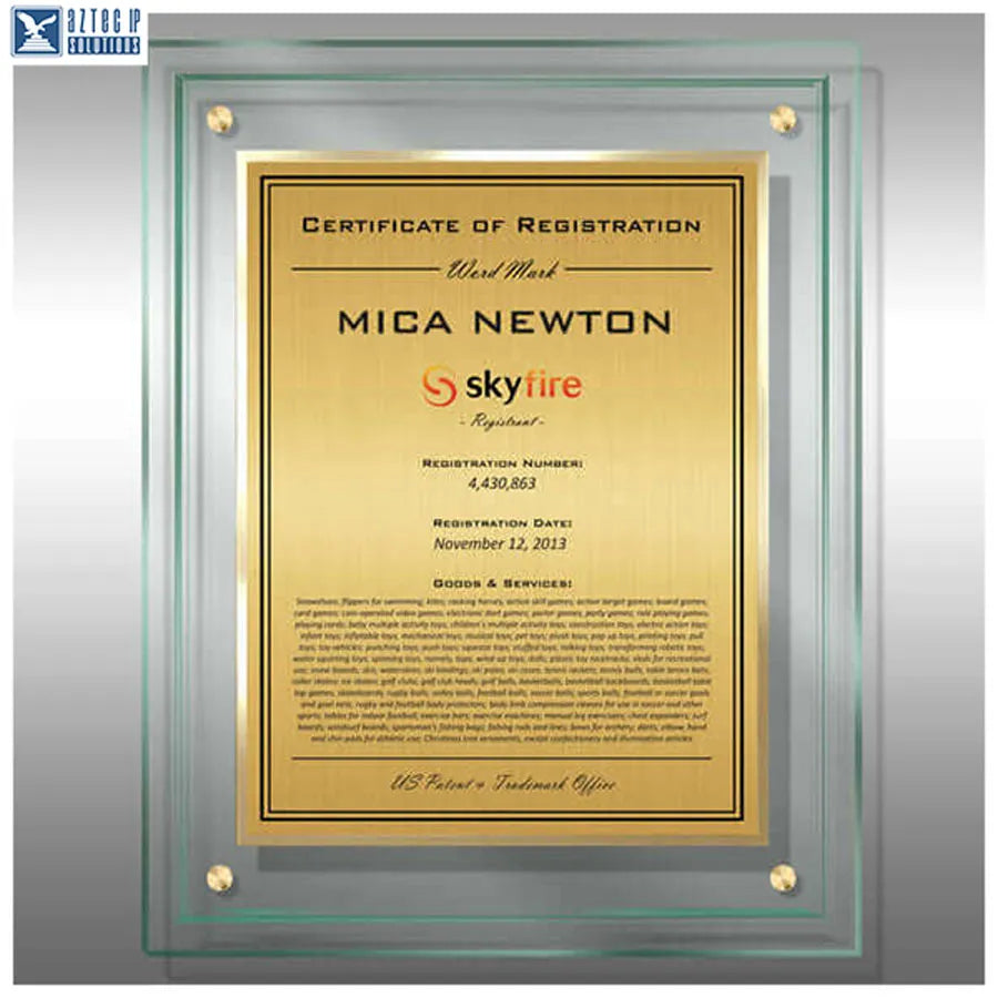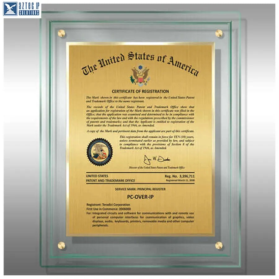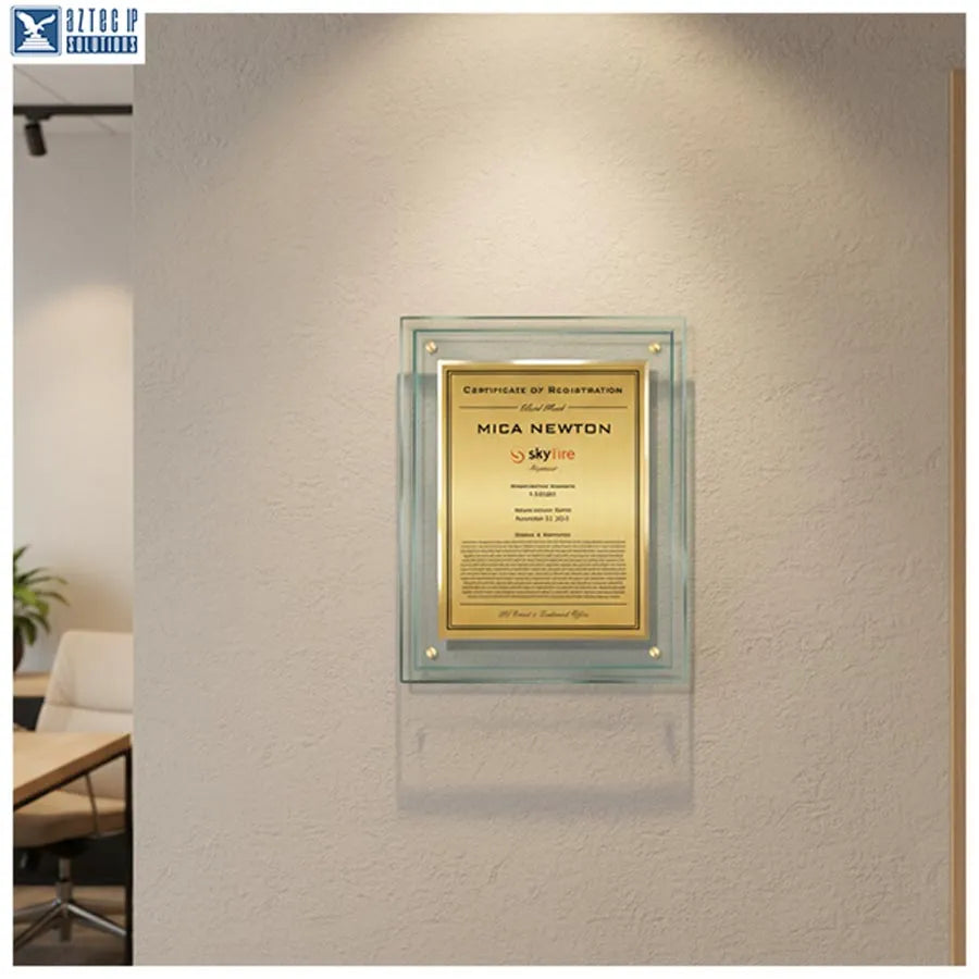 These trademark wall displays can be installed individually or together to showcase your corporate trademark portfolios.